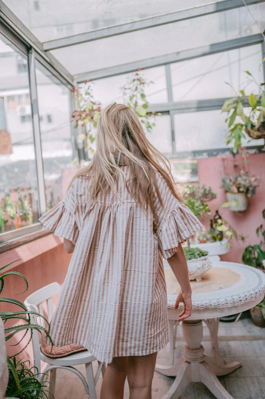 Vestido camisero, confeccionado en Tusor rayado con bolsillos y cuello en microfibra con estampa estilo vintage propia de Baticana
