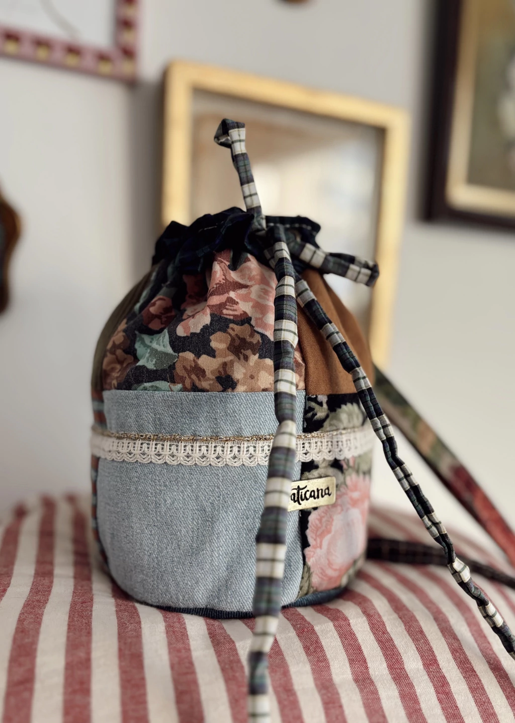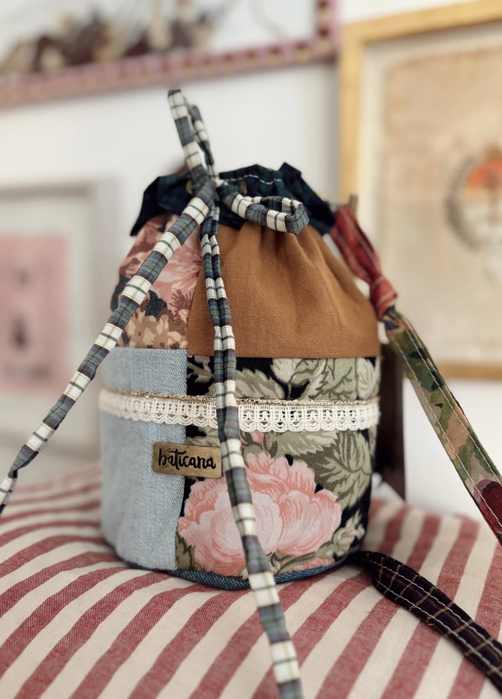 Morral confeccionado con técnica patchwork en diferentes textiles, con bolsillo interno y tiras regulables.