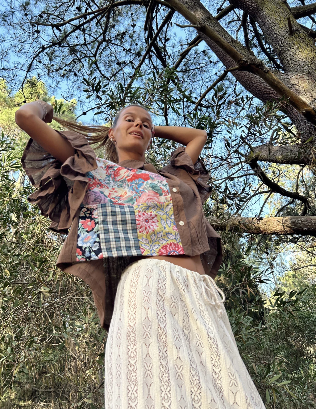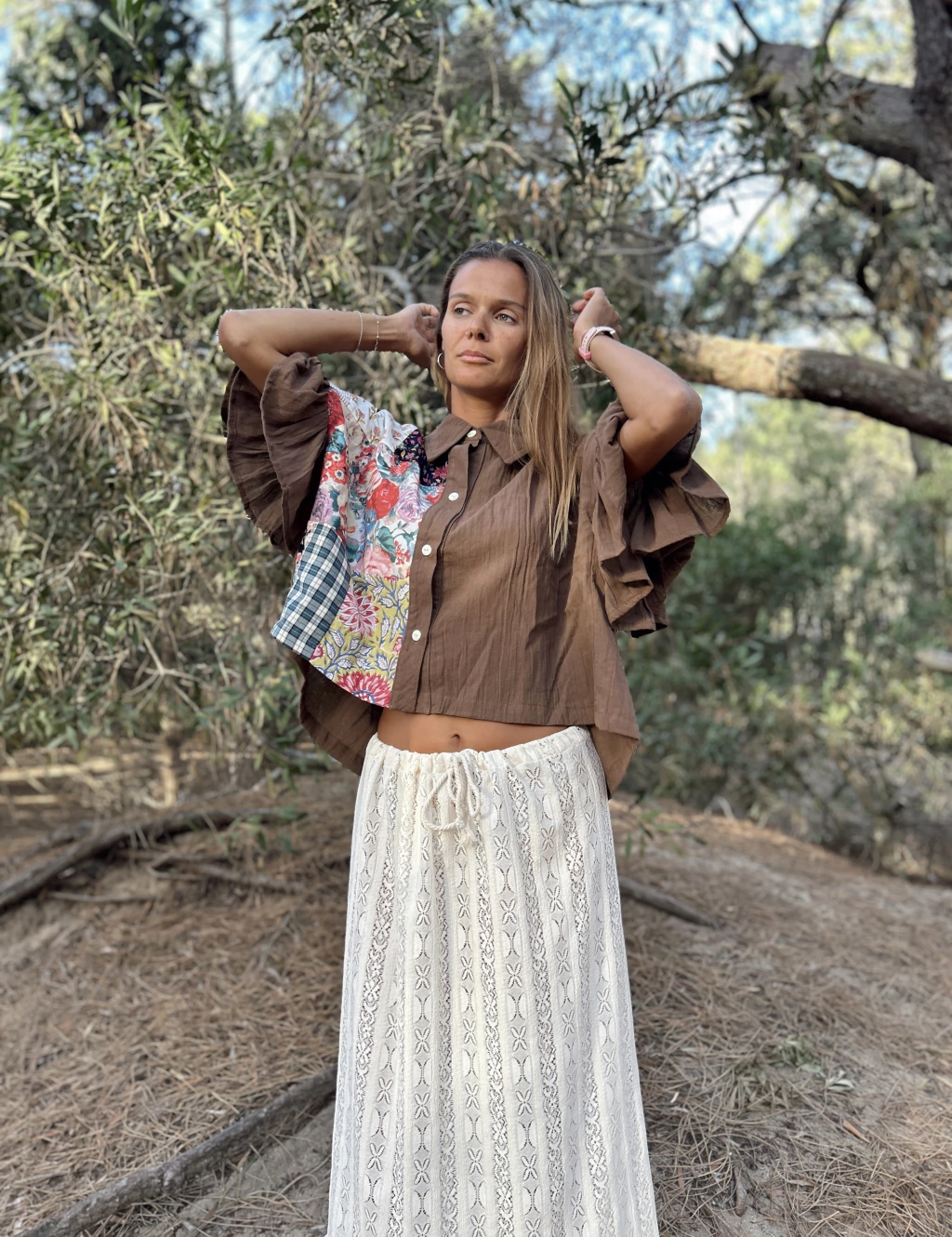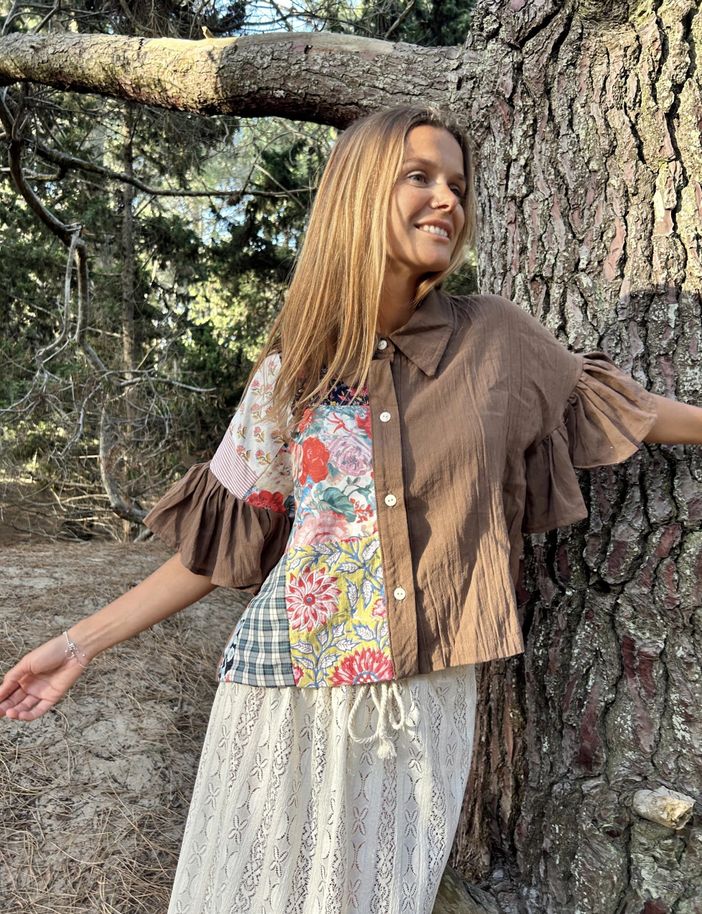 Camisita confeccionada en gasa de algodón, algodones block print y telas varias de nuestra marca en técnica patchwork, tiene un vuelo en mangas y espalda que son divinos y el corte es super comodo y tiene amplitud